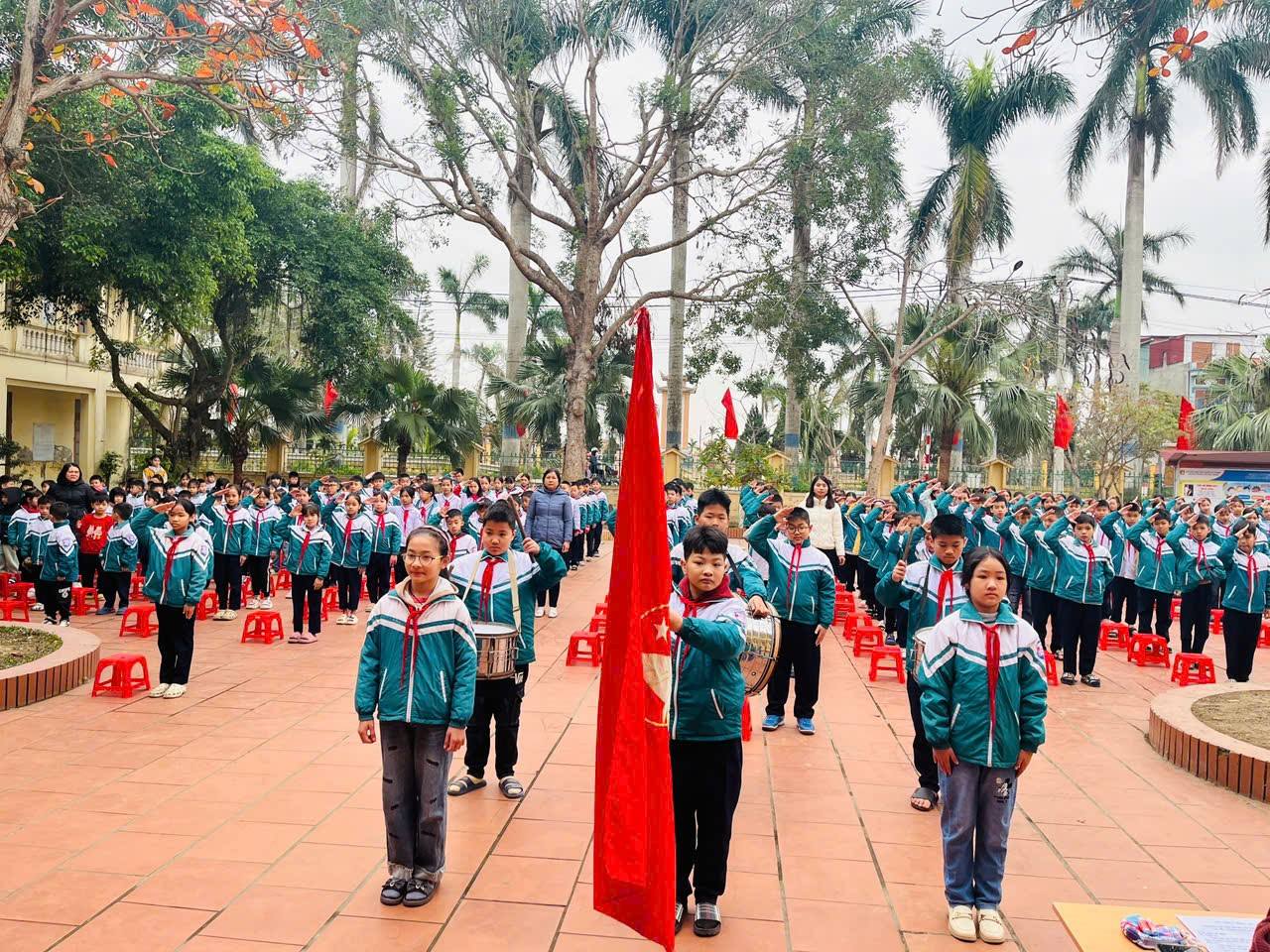 Thầy trò toàn trường cùng trang nghiêm hướng theo lá Quốc kỳ thiêng liêng của Tổ quốc, lá cờ Đội tung bay trước gió, cùng hát vang bài Quốc ca hùng tráng, bài Đội ca thể hiện niềm tự hào, khát khao, không ngừng phấn đấu của đội viên và nhi đồng. Toàn Liên đội cùng điểm lại những thành tích nổi bật đã đạt được trong tháng 03 và đề ra một số nhiệm vụ trong tháng 04, thi đua lập thành tích trong học tập và rèn luyện.